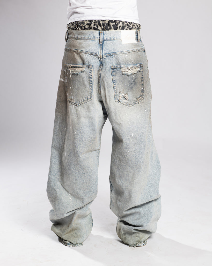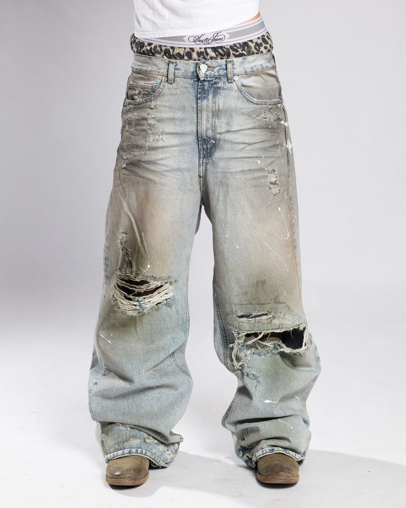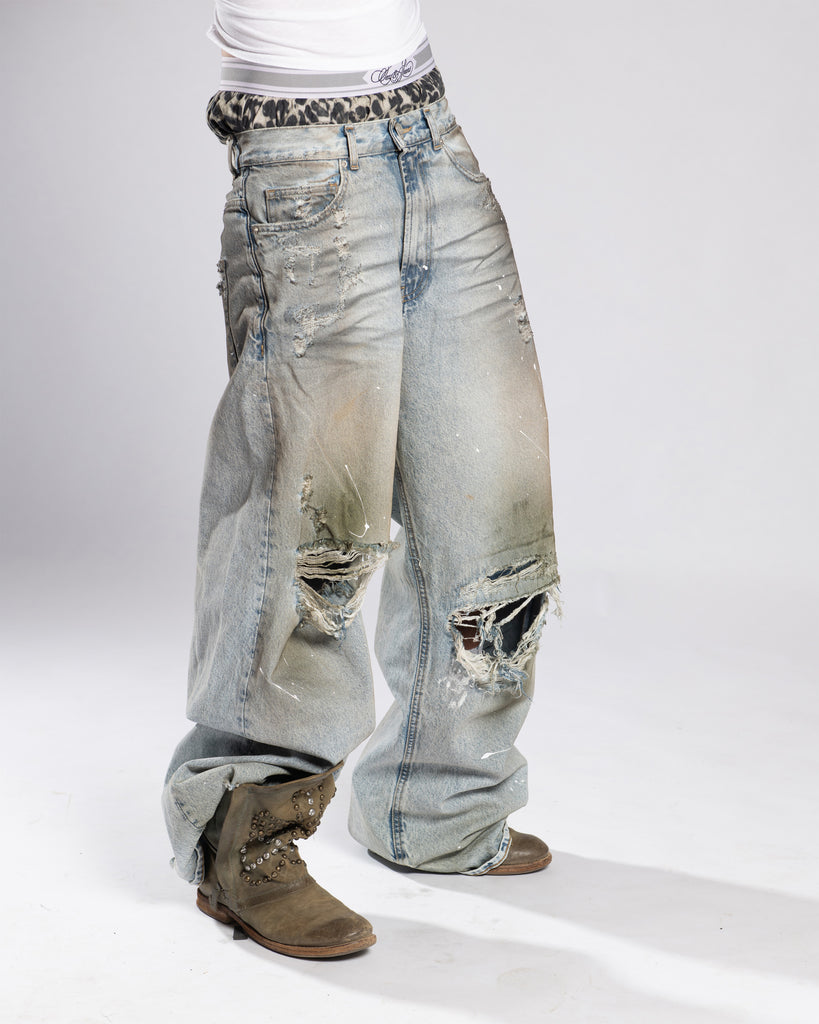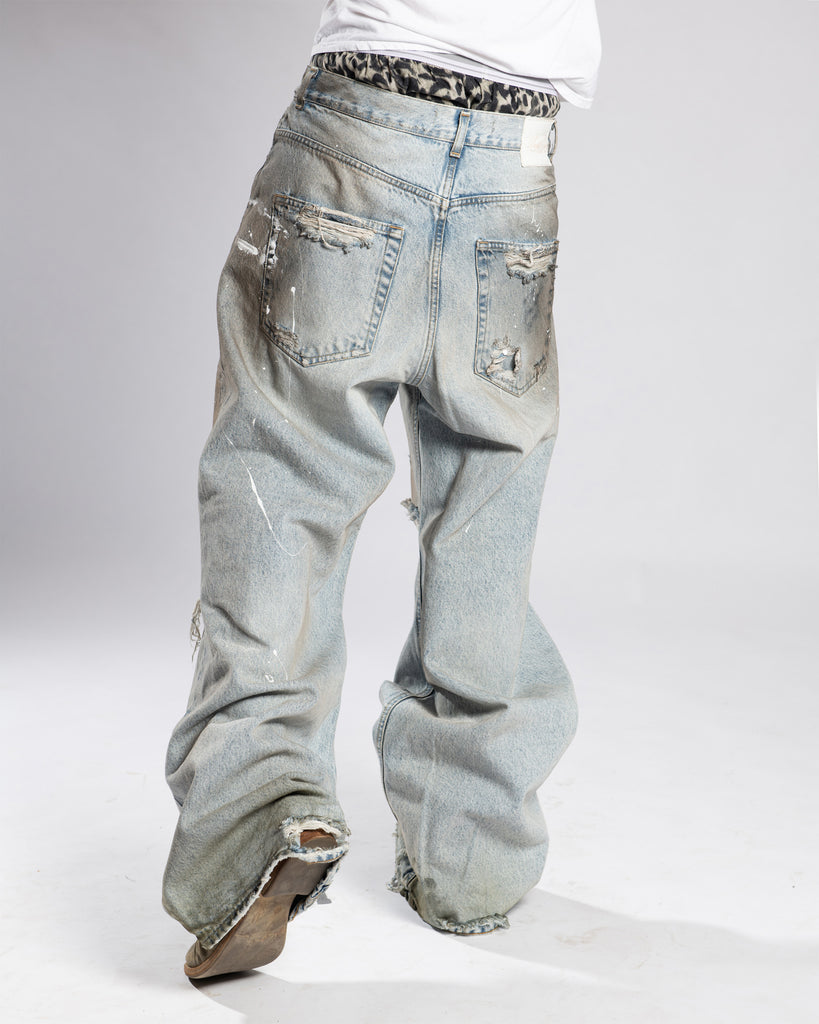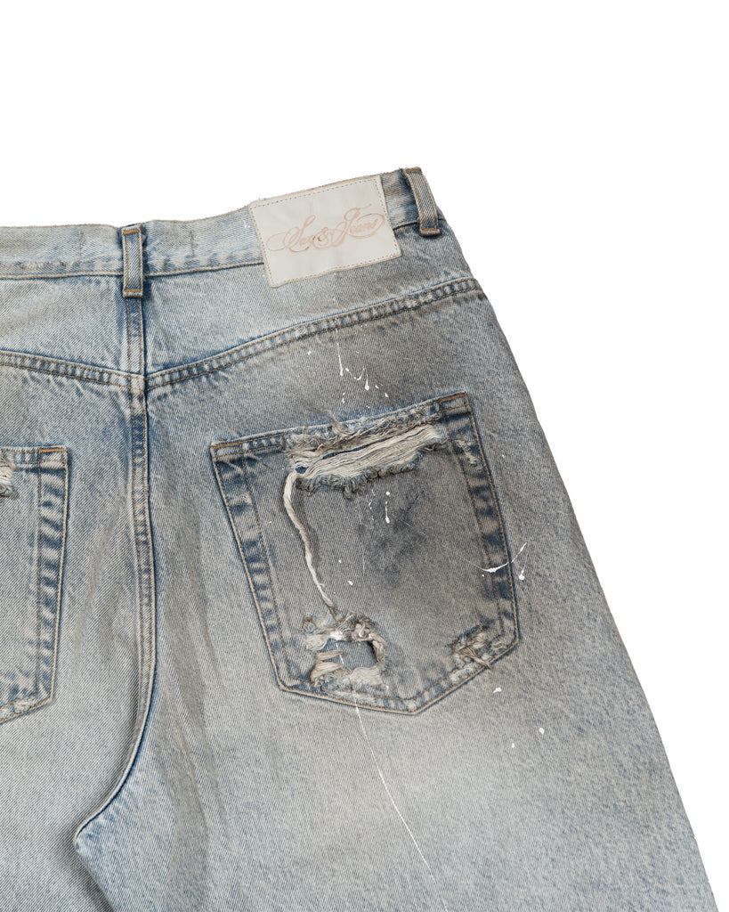 Light Wash Jeans with Paint Splatter, Ash and Grass Dirting, Distressing and Repairing